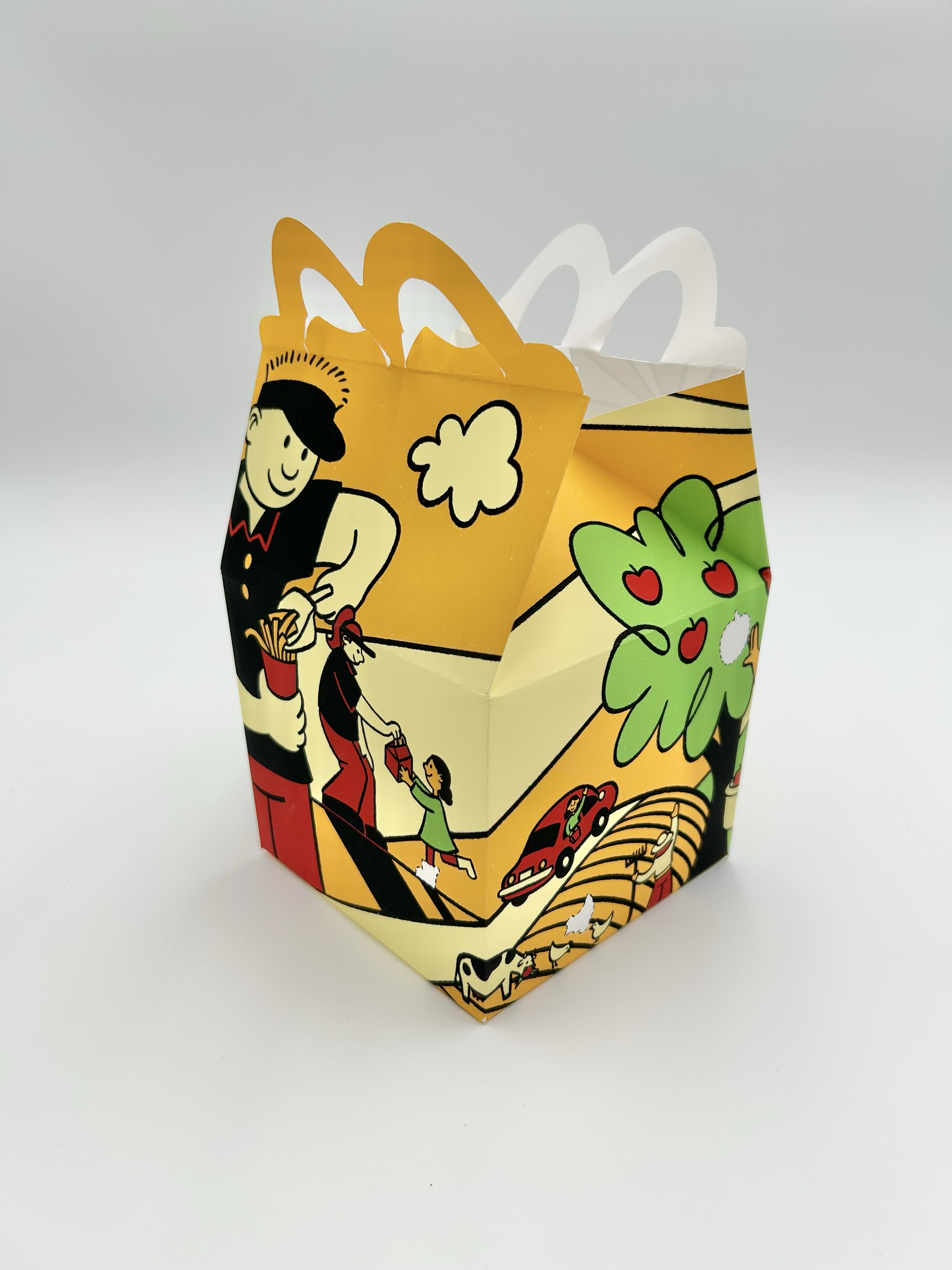 This illustrated rendition of a McDonald’s Happy Meal box features an interactive farm-to-table story where kids can put stickers in the blank spots of the illustration while they enjoy their meal. This was a senior package design project for my Illustration class with the goal of creating a design that was both functional and entertaining while maintaining McDonald’s existing branding.